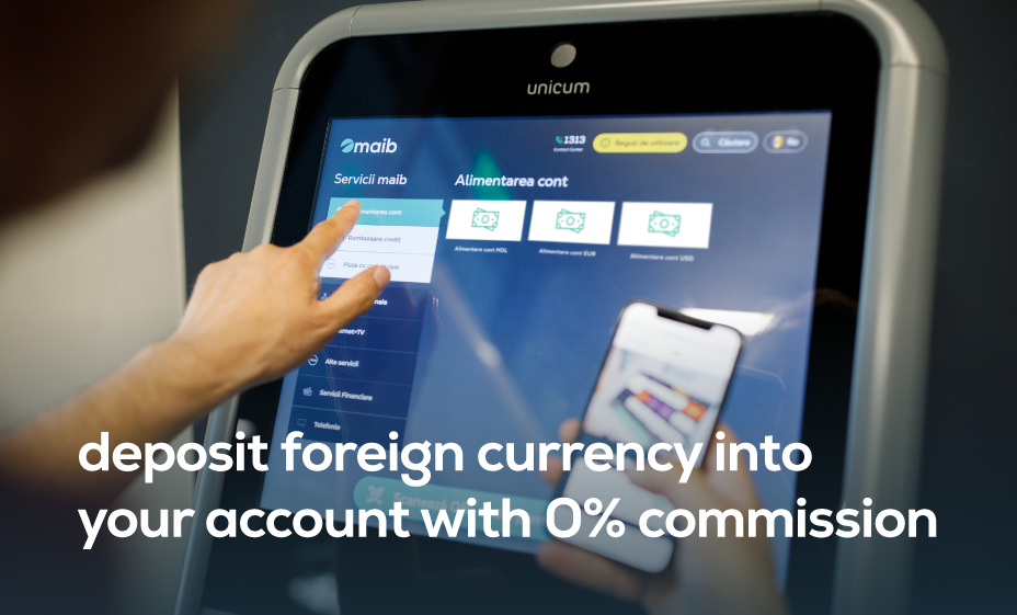 Maib offers you banking on favourable terms and flexibility in everything you do. Now you can top up your account in EUR or USD at any maib self-service terminal with 0% commission. The money arrives instantly, and you can use it as you wish.