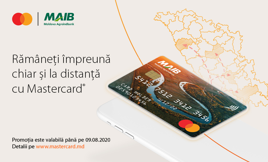 De astăzi lansăm campania promoţională „Rămâneţi împreună chiar şi la distanţă cu Mastercard şi Moldova Agroindbank”, la care poţi participa şi tu dacă deţii un card bancar Mastercard* emis de MAIB. Pentru a deveni eligibil în cadrul promoţiei, este necesar să efectuezi transferuri de bani de minimum 300 de lei de pe cardul tău MAIB Mastercard pe un card** Mastercard emis de o altă bancă din ţară sau de peste hotare, conform Regulamentului.