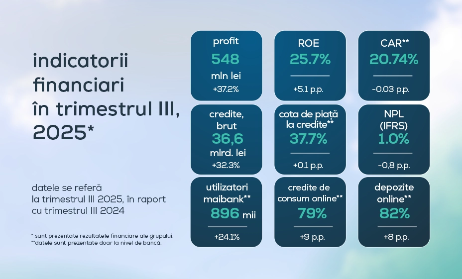 Suntem bucuroși să anunțăm rezultatele financiare ale grupului maib la finele trimestrului III al anului 2025. Maib a înregistrat un profit de 548 milioane lei, reflectând o creștere cu 37,2% față de aceeași perioadă a anului trecut.