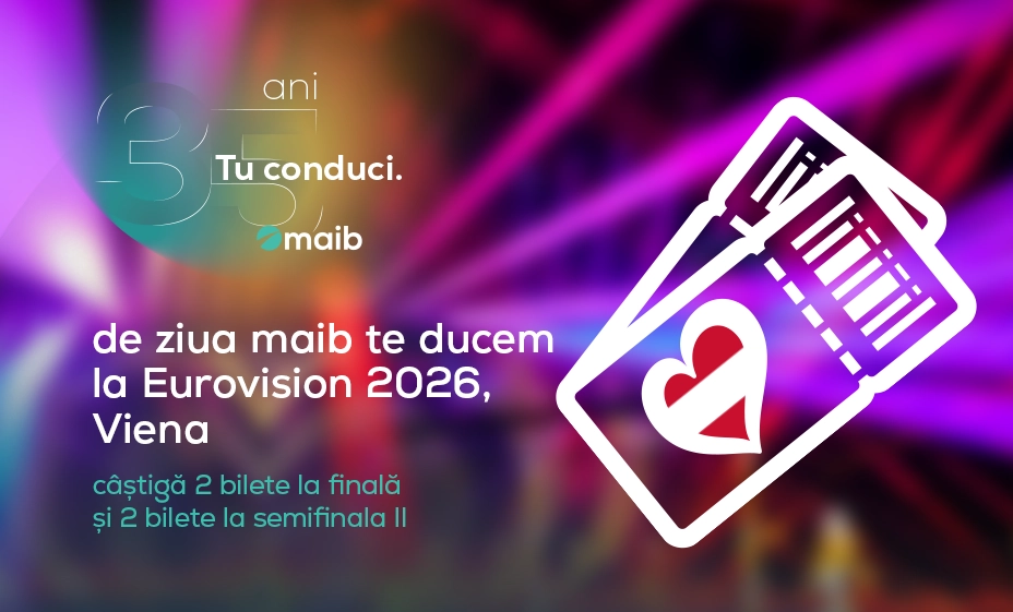 De 35 de ani, emoțiile și încrederea clienților noștri sunt cele mai prețioase pentru noi. De aceea, cu ocazia aniversării maib, pregătim o surpriză specială. Îți oferim șansa să ajungi la Eurovision 2026, la Viena, și să trăiești atmosfera unică a competiției direct din sală.