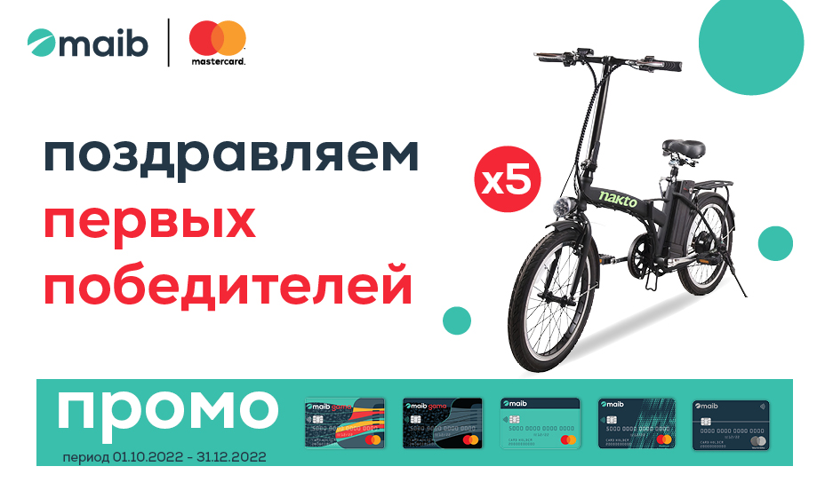 Maib и Mastercard порадовали пятерых клиентов стилизованными электрическими велосипедами. Татьяна Ферфеткая, Евгения Чебан, Виорика Лукашенко, Анжела Француз и Николае Пожога стали первыми победителями акции «Плати smart, выигрывай эко», которая проходит в период с 1 октября по 31 декабря 2022 года.