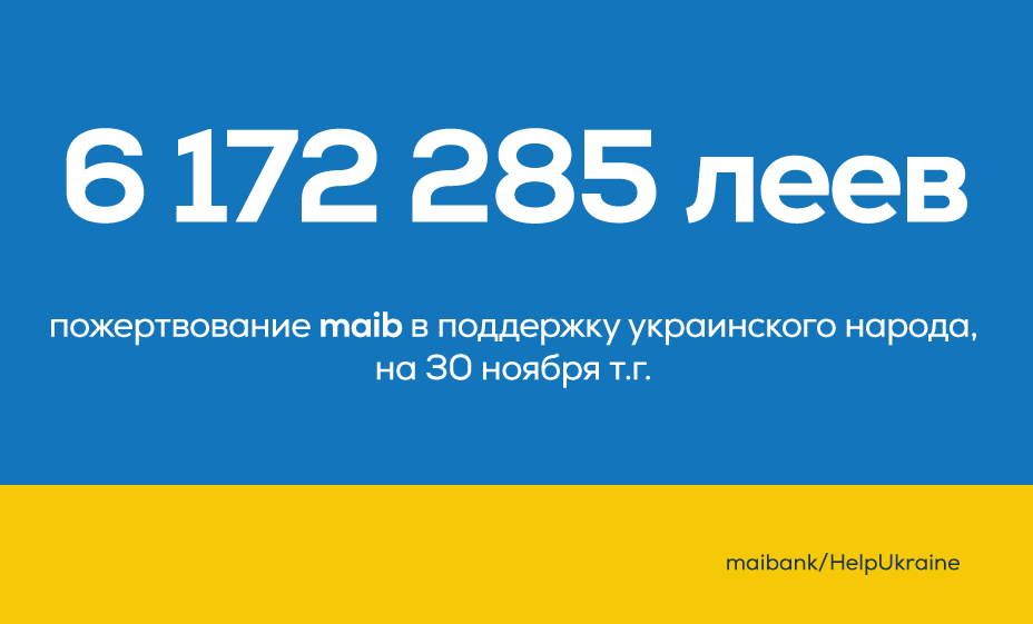 С момента запуска инициативы и до сегодняшнего дня maib пожертвовал сумму в 6 172 285 леев в поддержку украинского народа.